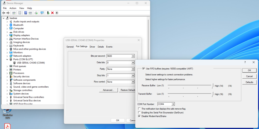 Connecting with CPWI over Mount-USB (MUSB)A direct, wired connection over USB is possible between the HBG3 and a PC running the CPWI software. This mode of operation is selected by sliding the (blue) MUSB switch of the HBG3 to the UP position, away from the circuit board.But MS-Windows sometimes makes this harder than it need be. Most HBG3 modules have a Silicon Labs cp210x USB-Serial chip onboard. These ones work fine without any fuss. No need to read further here. But some newer ones, mainly those with a USB-C connector instead of USB micro-B, have a CH34x USB-Serial chip onboard. Those are the ones that may need the tweak described below. This is because the CH340 device driver defaults to "ModemHandShake" mode, which causes the HBG3 to be reset when opened for access by CPWI. One determine that this is happening by watching the HBG3 OLED display, with the device doing a reset and briefly showing the QR-Code screen again, when attempting to connect from CPWI. i This mis-feature must be disabled for a MUSB connection to succeed. Go into the MS-Windows Device Manager, find the USB-SERIAL CH340 device there under Ports (COM & LPT), and go into the Port Settings, Advanced, and check the box for Disable ModemHandShake. Then click OK, and OK.. until back at the main Device Manager window. All should be good after making that change. Linux systems don't have this issue, even hosting VirtualBox to run CPWI inside a MS-Windows virtual machine (VM) on the Linux system. |